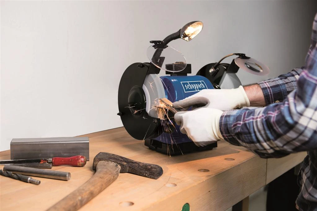 De tafelslijpmachine kan lang gebruikt worden en is uiterst duurzaam door de krachtige motor, de robuuste metalen constructie en de precieze kogellagers. De slijpmachine heeft geïntegreerde rubberen bumpers, verstelbare werkstuksteun en oogbeschermkappen met vergrootglas.