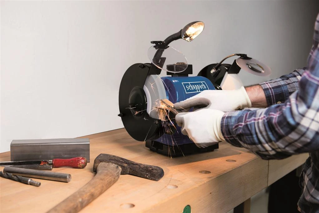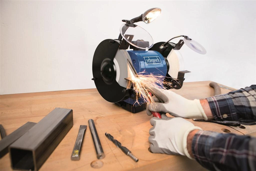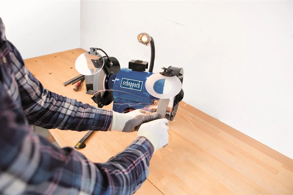 Scheppach BG200AL dubbele tafelslijpmachine 8″. Deze tafelslijpmachine heeft zowel een grijze steen als een witte steen van 40 mm met een fijne korrel. Geschikt voor verschillende projecten, zoals afbramen, roest verwijderen, vormen, polijsten en het scherp maken van snijgereedschap. De tafelslijpmachine kan lang gebruikt worden en is uiterst duurzaam door de krachtige motor, de robuuste metalen constructie en de precieze kogellagers. De slijpmachine heeft geïntegreerde rubberen bumpers, verstelbare werkstuksteun en oogbeschermkappen met vergrootglas.