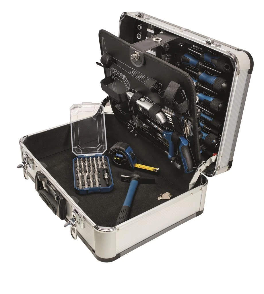 De koffer is veilig af te sluiten door het sluitingen. De koffer heeft echter geen hangslot mogelijkheid. U kunt hem gemakkelijk meenemen met het fijne handgreep. De gereedschapsset wordt ook geleverd met de uit 101 stuks bestaande gereedschapsset. En biedt hierbij alle essentiële gereedschappen voor huishoudelijk gebruik, van hamer tot waterpomptang.
