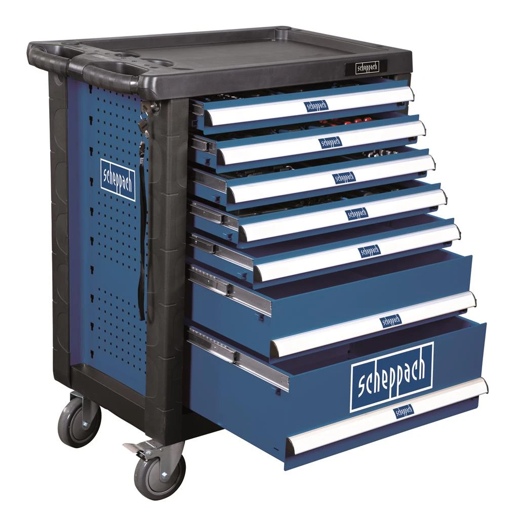 Altijd het juiste gereedschap. De Scheppach TW1000 gereedschapswagen is een compleet gevulde gereedschapswagen op wielen. De sterkte constructie wordt geleverd inclusief 263 tools! Met dit grote aantal gereedschap kun je veel kanten op. Elke tool heeft zijn eigen opbergmodule, waardoor alles eenvoudig is terug te vinden. De wielen hebben een remstand en zijn flexibel te bewegen. Verder beschikt de TW1000 over 7 “easy-pull” laden. De inhoud bestaat uit de volgende gereedschappen: hamers, combinatiesleutels, sleufschroevendraaiers, borgringtangen, ratelsets, geïsoleerde schroevendraaiers, precisie schroevendraaiers, inbussets, krimpgereedschap, kruiskopschroevendraaiers, punttang, combinatietang en zijkniptang.