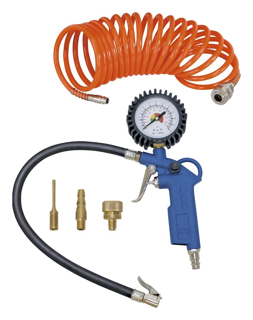 - Bandenpomp: Deze bandenpomp heeft een rubberen manometer beschermer, dubbel schaal (bar/psi) manometer en een deflatieknop