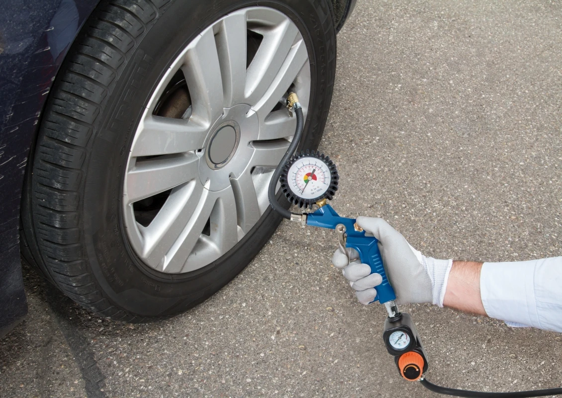 - Bandenpomp met manometer, dubbele schaal (bar/psi) en deflatieknop