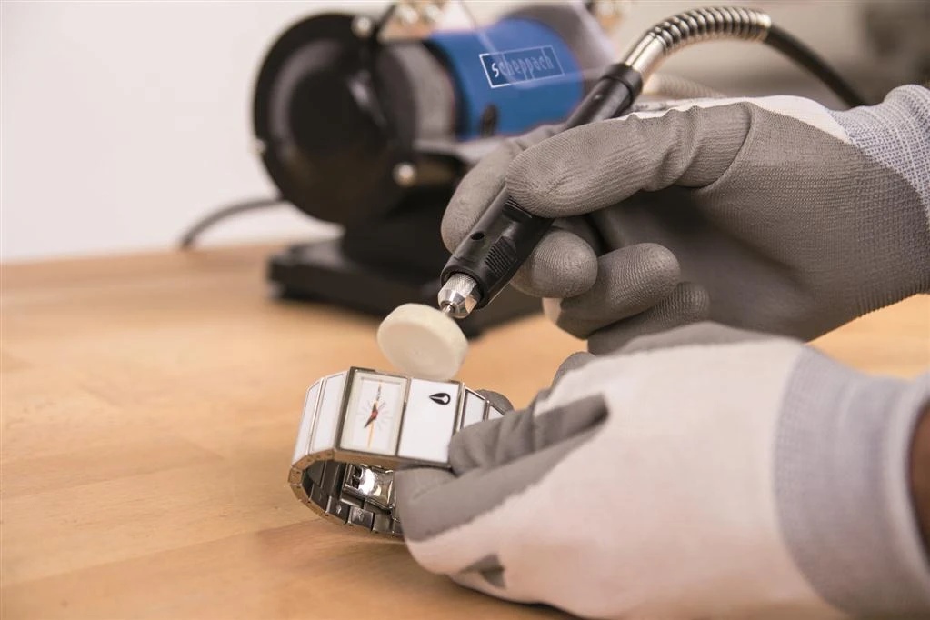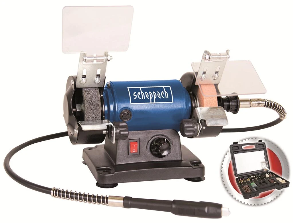 Scheppach HG34 slijp- en polijstmachine 3″ met accessoires. Ideaal voor doe-het-zelvers en in kleine werkplaatsen. Bij deze slijpmachine wordt een 100-delige toolkit geleverd om van deze topslijpmachine een unieke multifunctionele slijpmachine, polijstmachine en schuurmachine te maken.